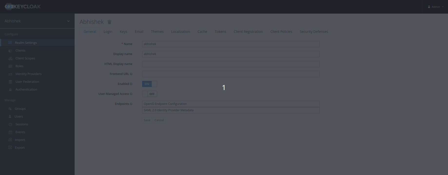 Realm settingspage. After that you need to click on the “Manage Account" link at the top and then it will show you theaccount consolepage as is shown below: