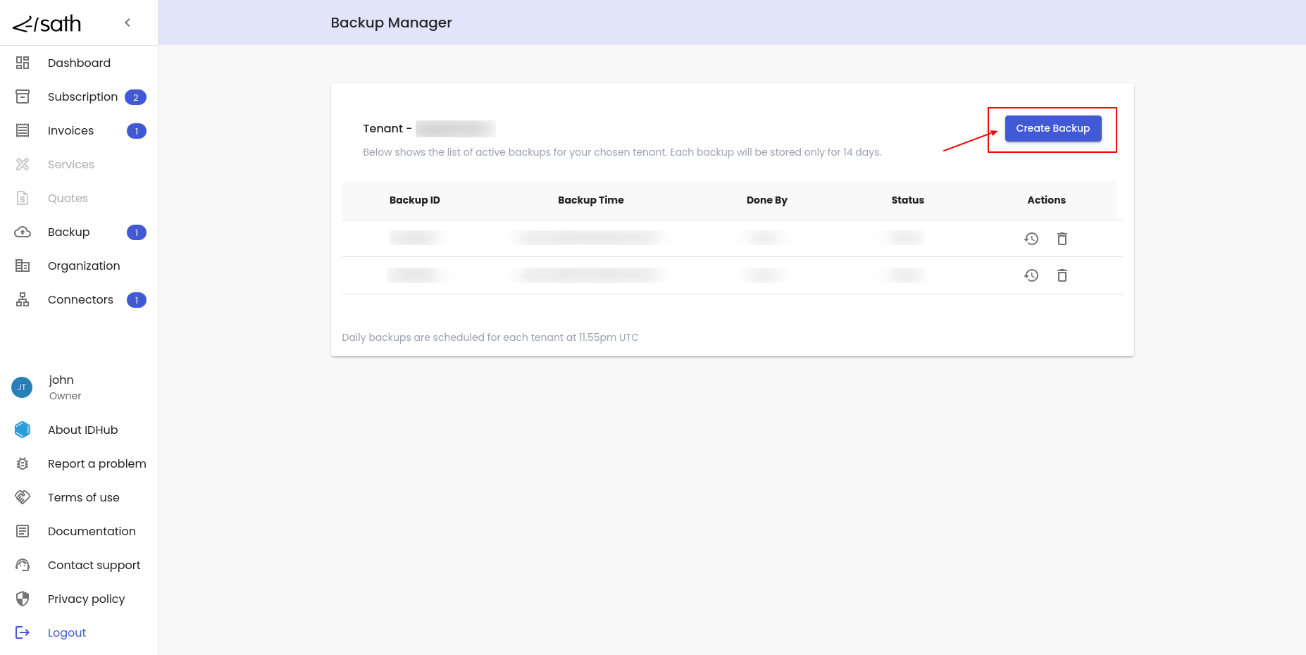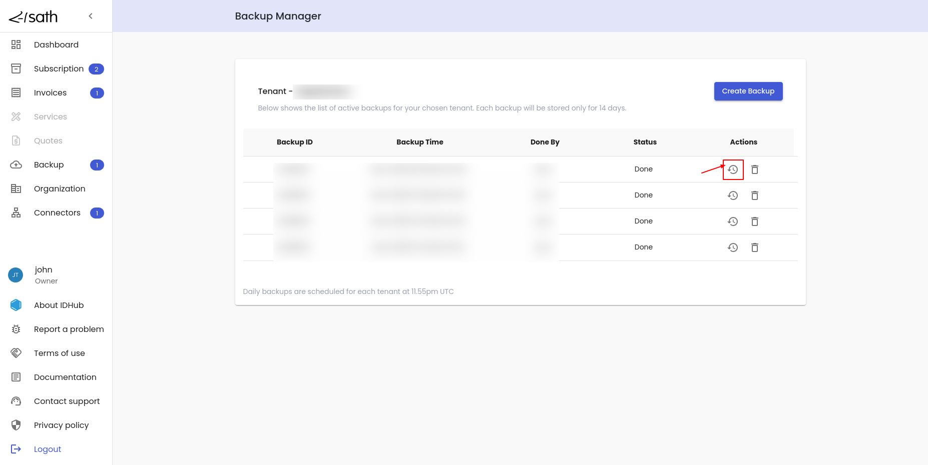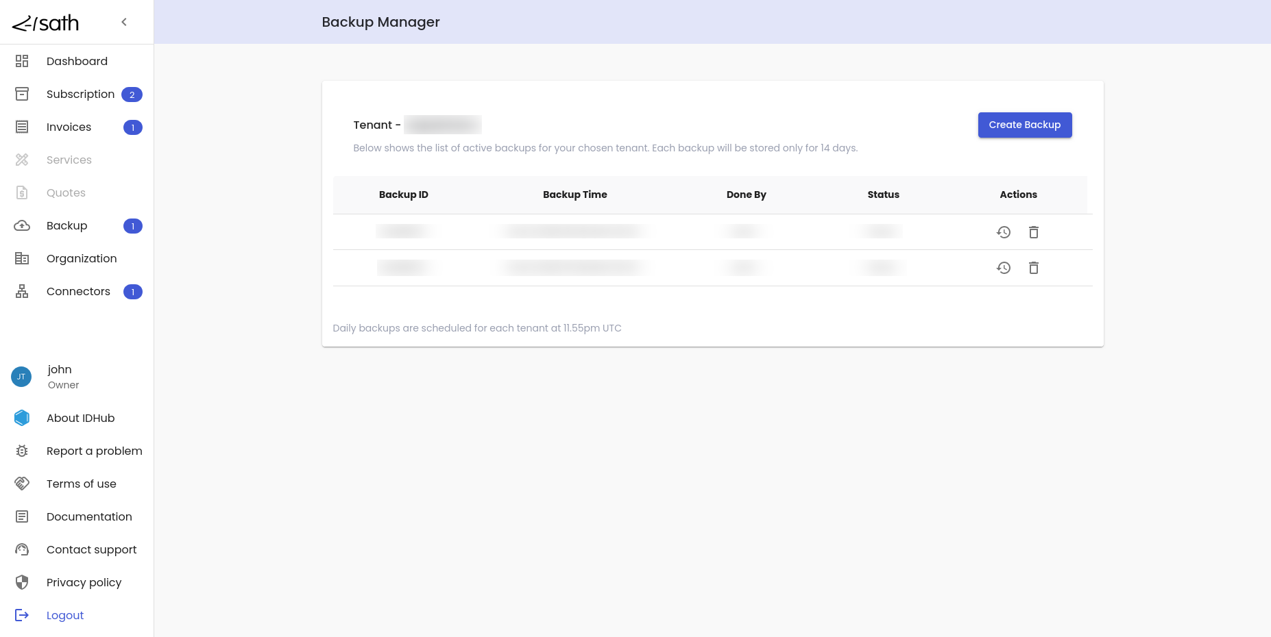 • IDHub creates the backup of the tenant and once the backup is completed, it will be added to the list of backups.
