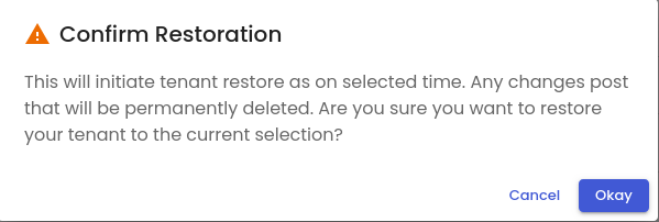 • A confirmation dialog box would open, to make sure that you would really like to restore the tenant data from the backup.