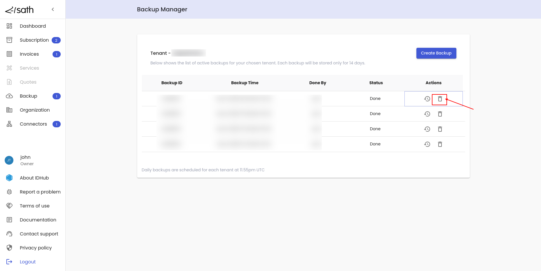• IDHub would delete the backup and the backup list would be updated accordingly.
