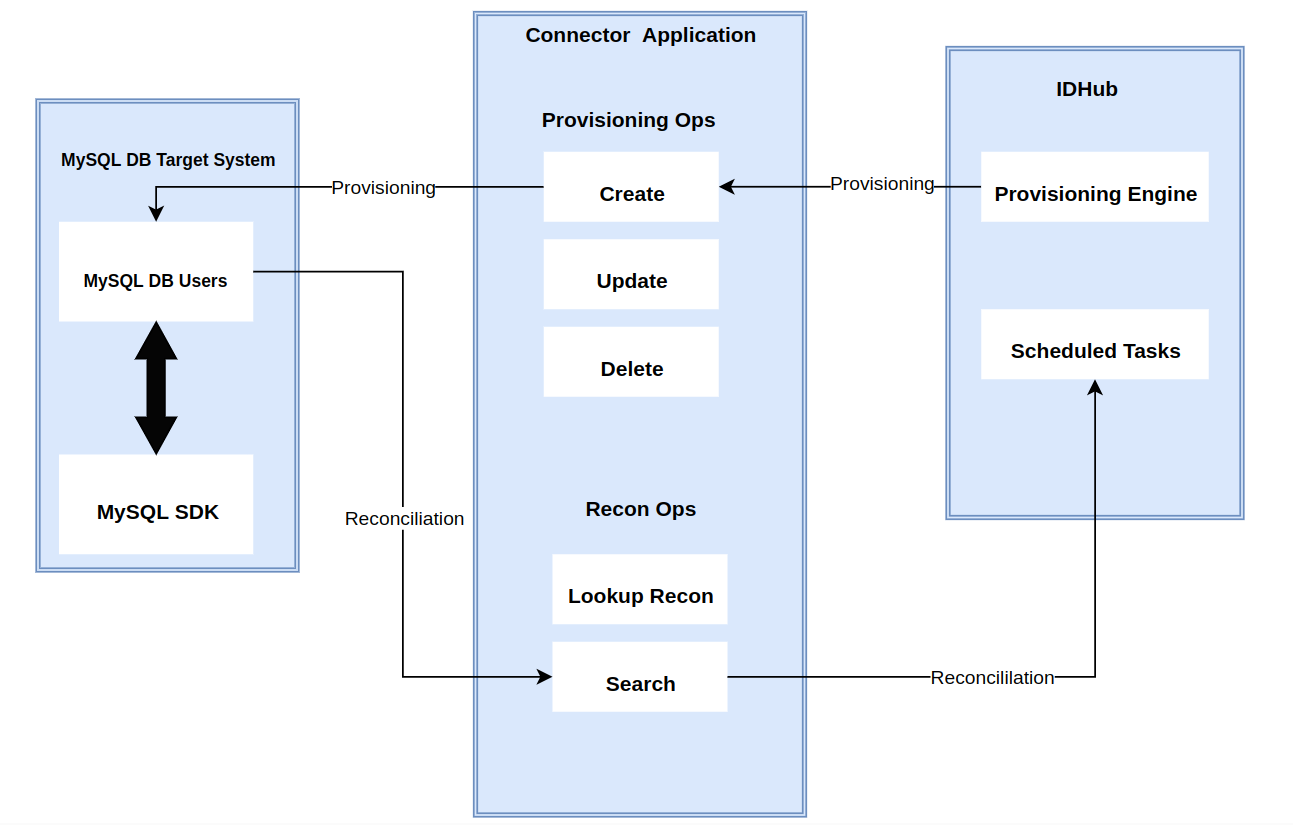 The connector's architecture is constructed in accordance with the diagram below: The connector architecture primarily consists of a connector application and a target system component. The native communication with the target system is handled by the target system by leveraging the IDHub implementation of the MySQL Specific connection. This architecture is implemented because it allows for rapid and straightforward connector deployment as well as precise versioning capabilities.