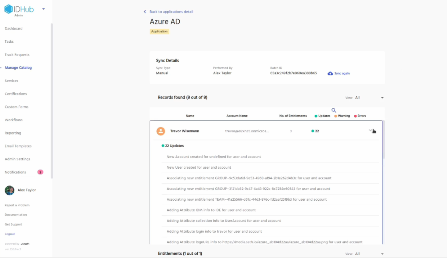 Click on the view link in one of the logs. You will be redirected to the details of the log where you can see the users or entitlements that have been synced.
