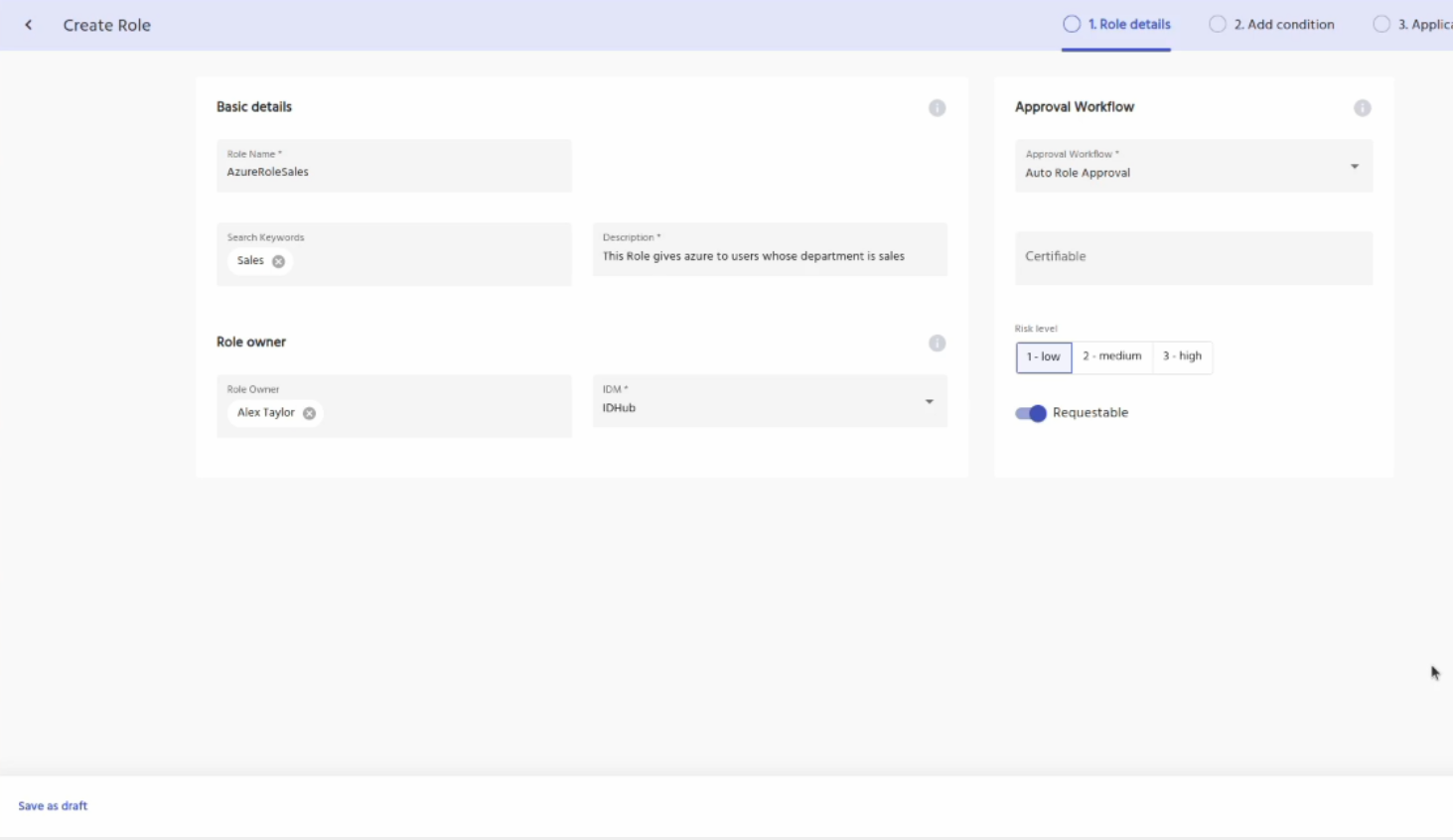In the first screen enter the required basic details of the role and then click on the next button. In the next screen add a condition, that department is sales as shown below.