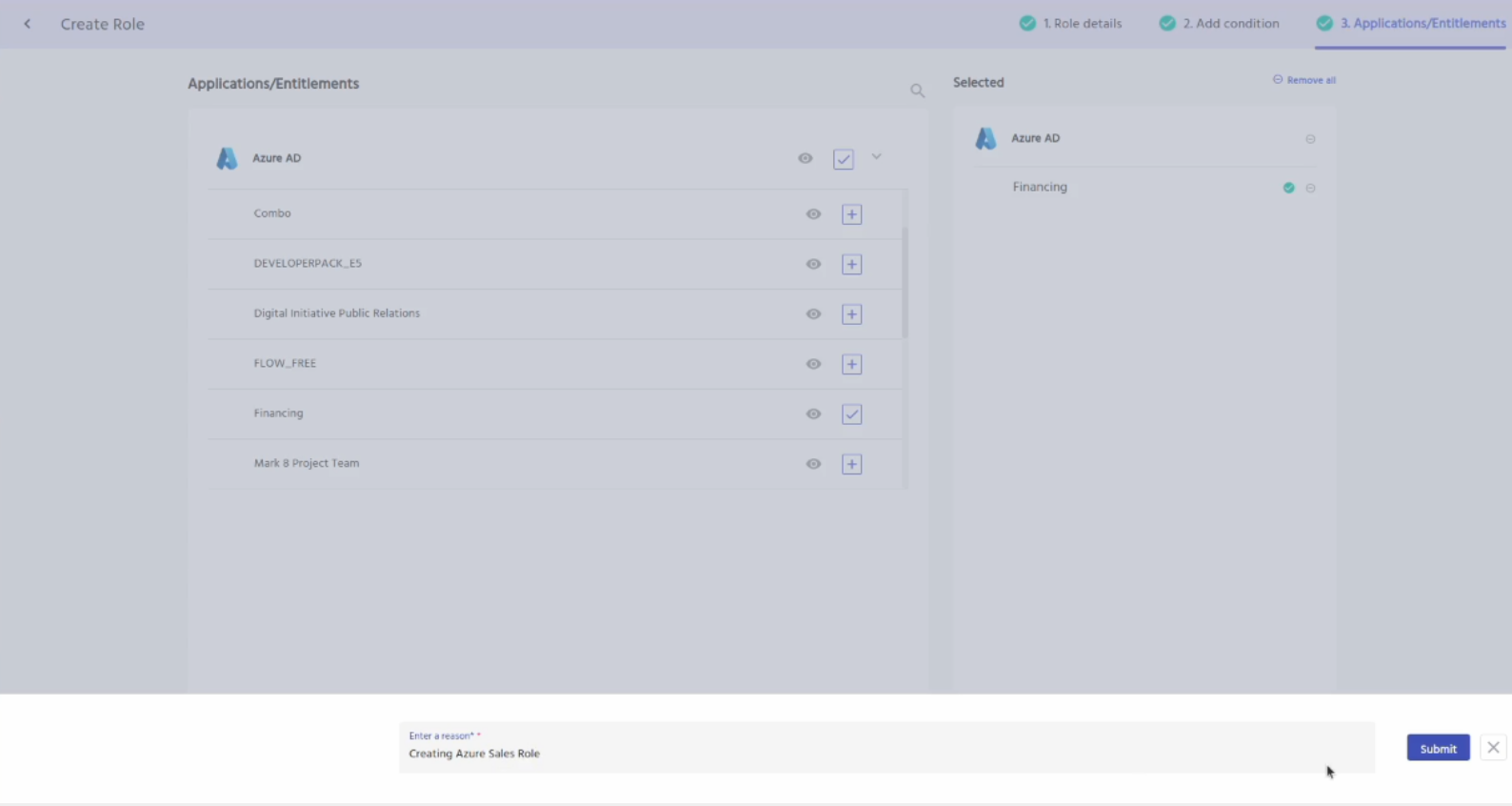 Click on the submit button. Enter a reason for creating the role.