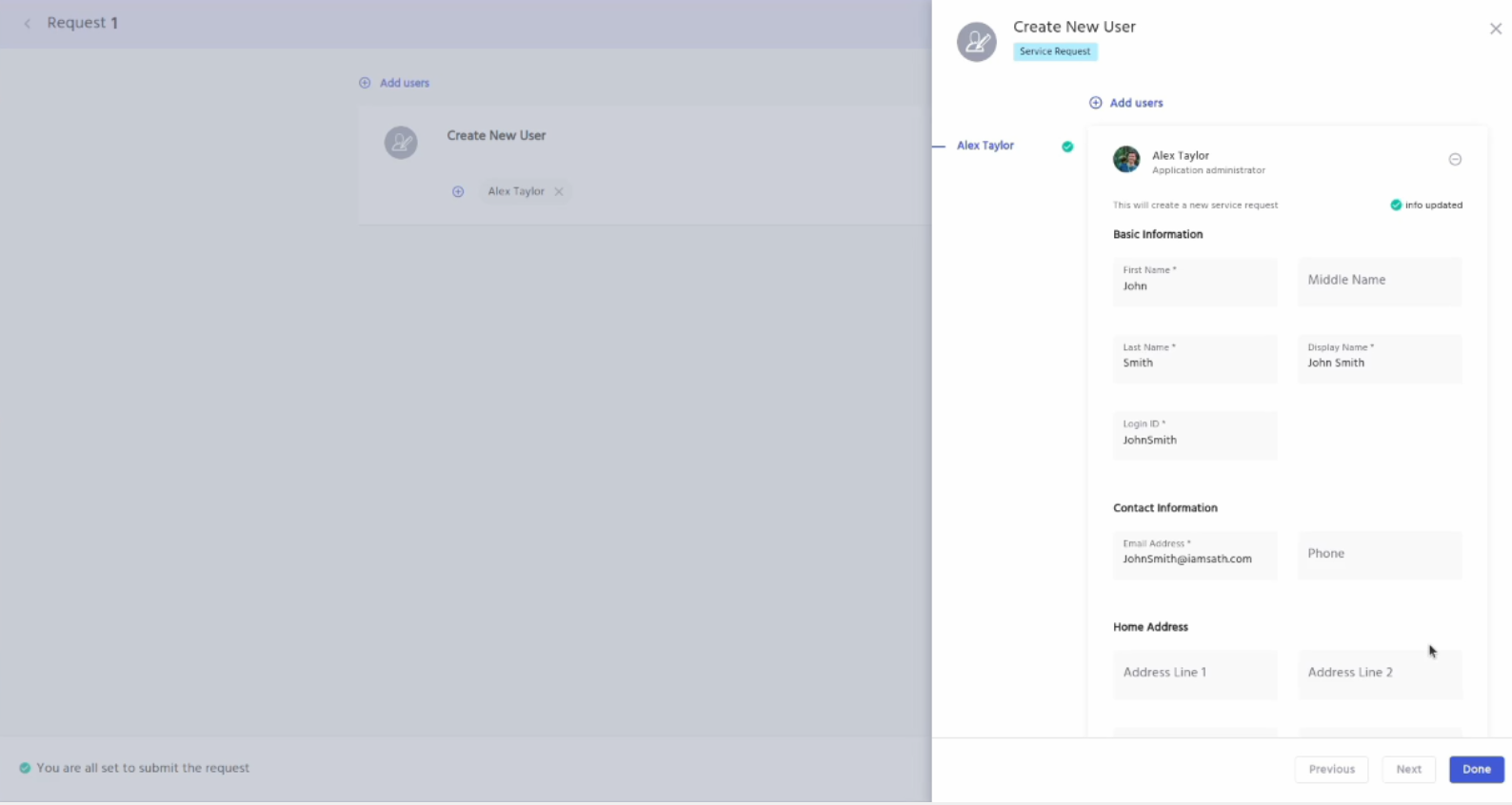 Now let’s create a new user whose department is sales to check whether that user automatically provisioned Entra ID application or not. For creating a new user goto the IDHub user app, click on the search catalog, click on the service requests tab and then click on the new user request. Add it to the cart and click on the proceed button and you will be taken to the screen as shown below: