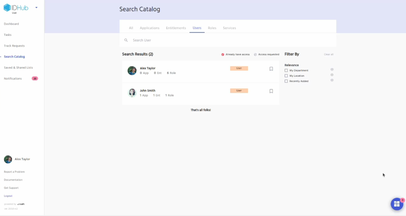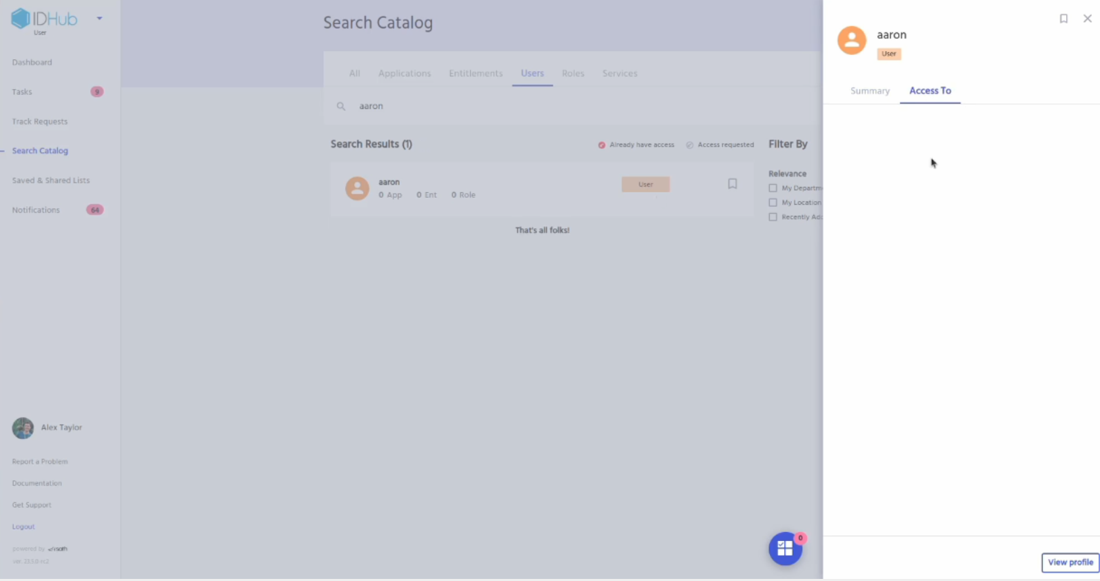Go to IDHub user app, click on the search catalog and then click on the users tab. Search for the user whom you have just revoked access via certification.
