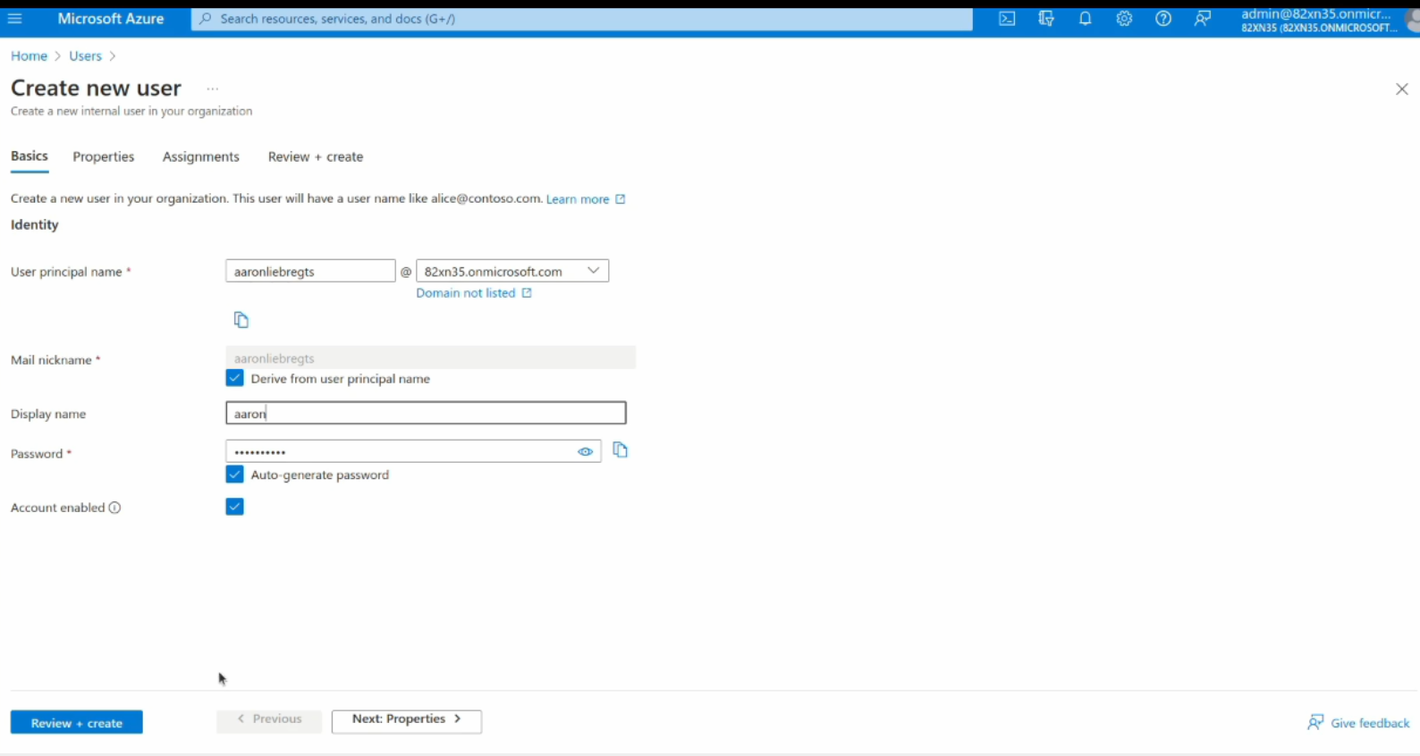 In this screen add the user principal name, display name and password and click on the Review & Create button below.