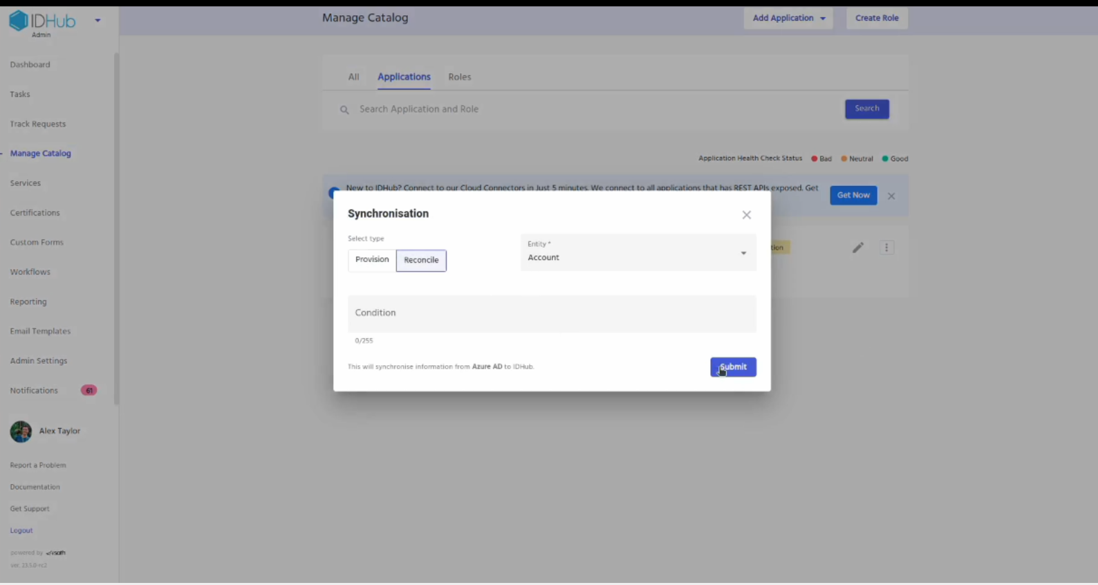 Now goto manage catalog, click on the 3 dots menu for the Entra ID application, click on the Application Sync menu