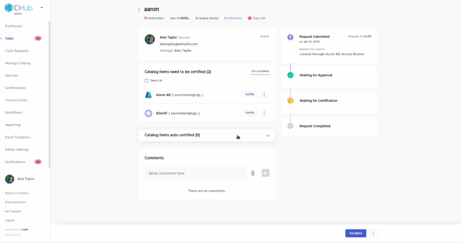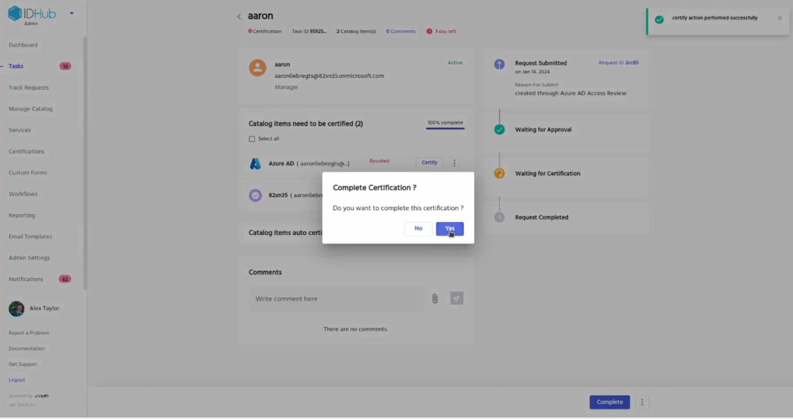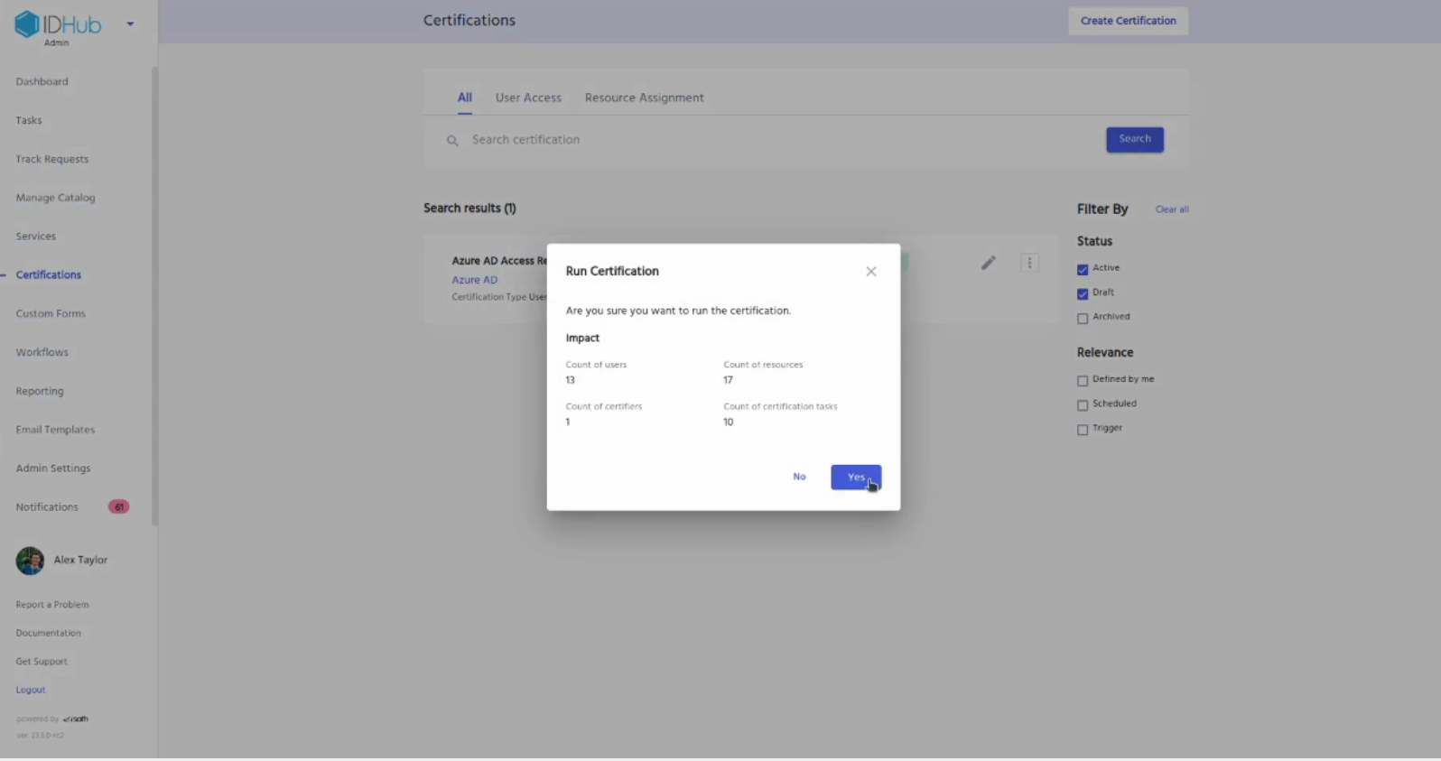 • This will create a certificate definition for you in your IDHub tenant. This you can later modify for performing access reviews on your Entra ID accounts.