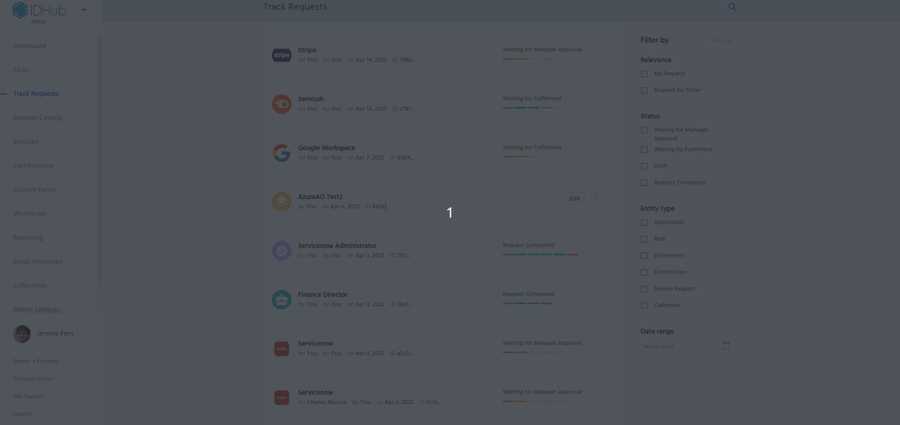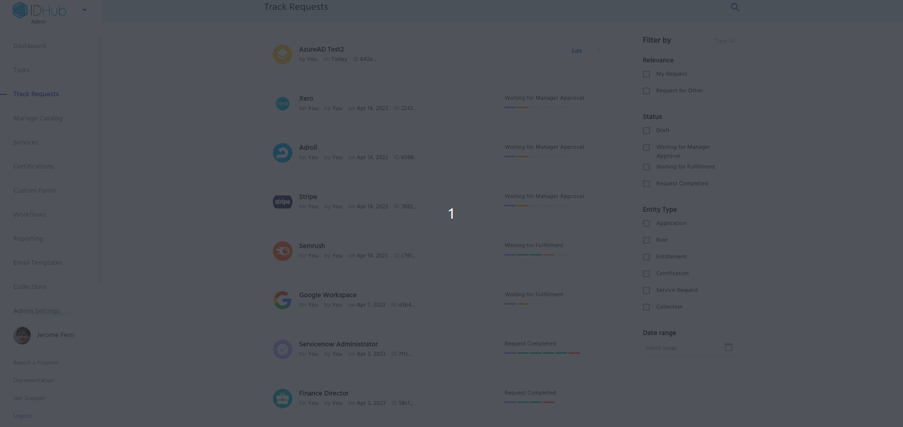 Track Requests' in the Admin Module of IDHub using the credentials of a user that has the role of 'System Administrator' with them. To learn more about IDHub roles, click here - The application and role details will be there in the draft card.