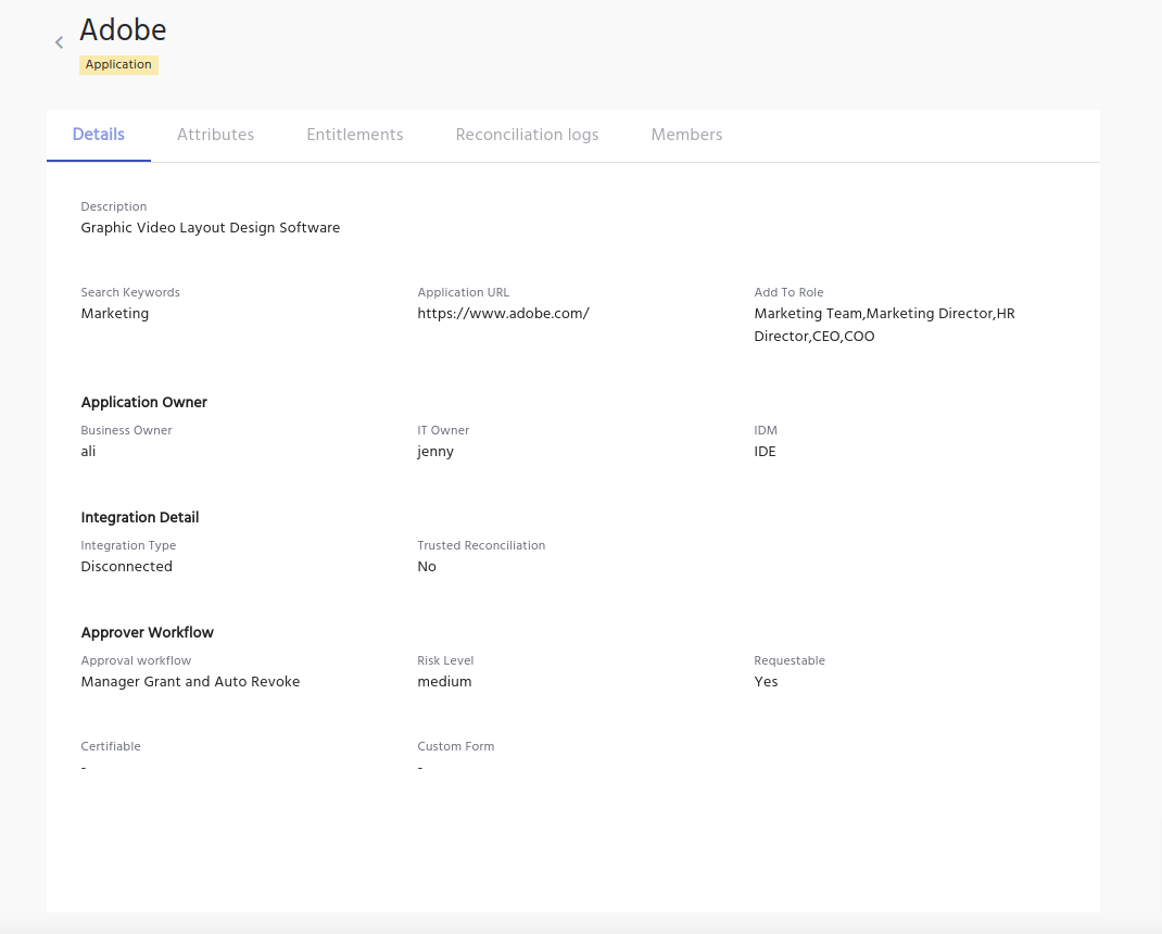 Description- This is the description for the application for better user understandingSearch Keyword- These are keywords for the application which will aid in robust searchingApplication URL- This is for single-user redirection to all applicationsAdd to Role- These are the Roles which are associated with the applicationApplication Owner - This gives information who is the resource owner and IT owner of the applicationIntegration details- This gives information on whether the application is a connected application or a disconnected application.Trusted Reconciliation- This gives information on whether the application is trusted or non-trusted.Approval Workflow- This defines the workflow of the applicationRisk Level- This communicates risk scores to users of the applicationRequestable- This serves to determine if the application is available to end users for manual requests or not.Certifiable- The most frequent usage of this is to detect certain compliance-related tags, such as HIPAA, NERC-SIP, etc., during access reviews.Custom Form- This determines whether the application is attached to any custom form.
