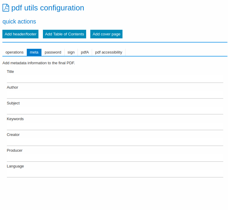 If you want to add any meta data to the PDF, then you can click on the button “Meta” and it will show the following screen:
