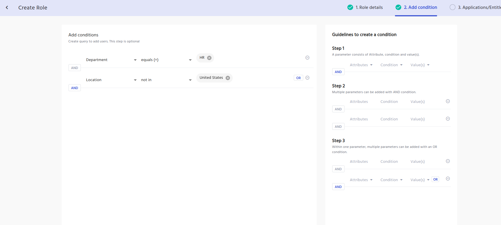 You can also add multiple conditions to the Role, to cater to some more complex scenarios. For instance you might want that users belonging to the HR department and whose location is NOT United States should get access to the role that you are creating. Then you add a condition as shown below:
