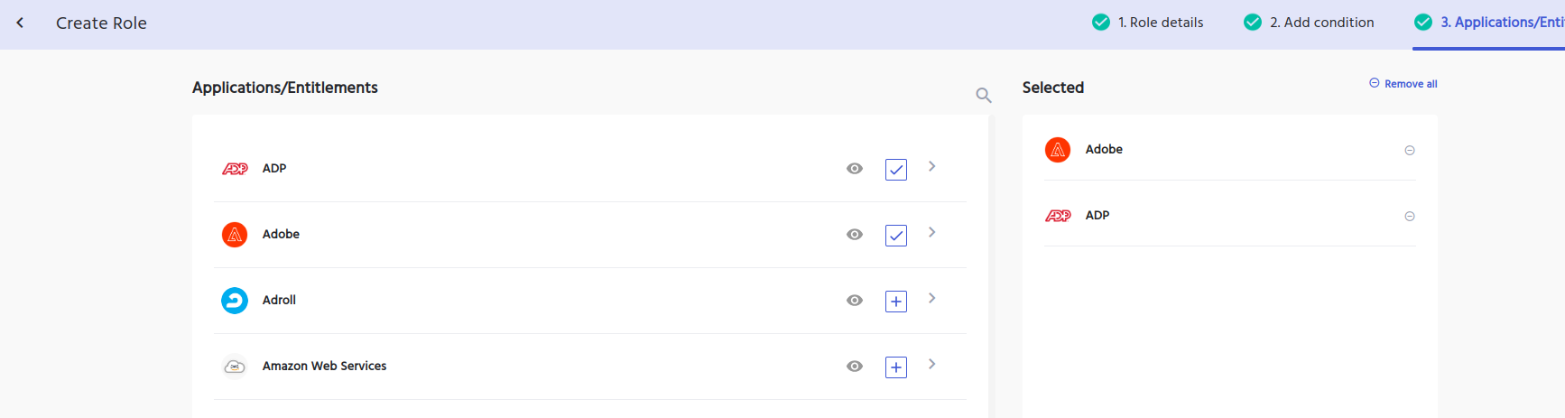 Now the last step of creating the role definition is to add the application / entitlements that would be there for the role and when the role is provisioned for the user, then provisioning would be done for those items as well.