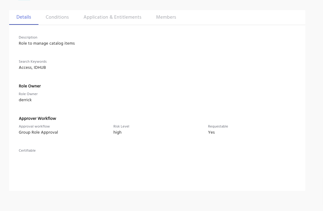 The details page of the role will provide details of the role definition in a view read only format. The following information would be included in the page: