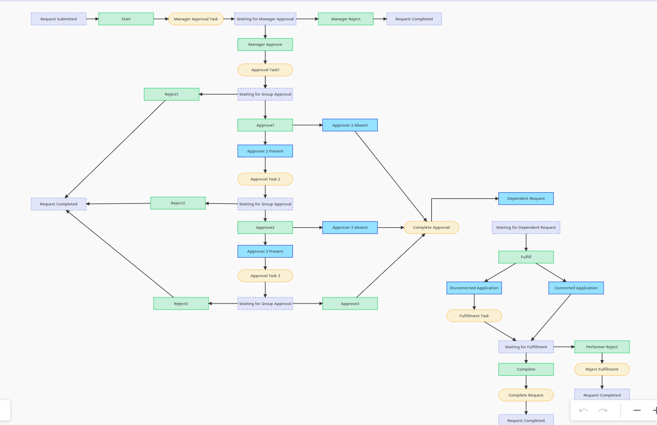 • Request completed state node to denote that the request has been completed once the fulfiller has approved the request.